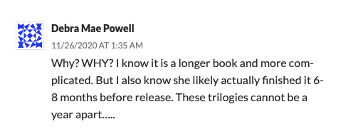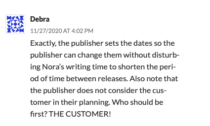 The book I just ordered has a letter to the reader in the front matter, and she even states she enjoyed being the narrator of her characters’ story. And her book reads exactly like that. Two hundred and fifty pages of her telling us what her characters are doing and feeling.